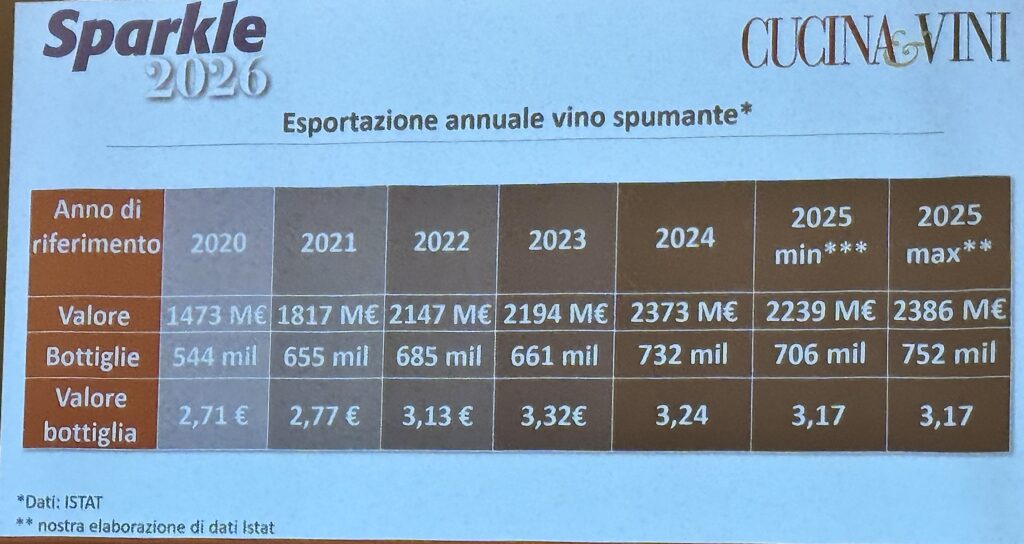 Il contesto in cui nasce Sparkle 2026 è particolarmente favorevole. Ad agosto 2025 il valore dell’export vinicolo italiano è stato ancora in crescita rispetto al 2024, confermando la solidità del comparto. Nel complesso, da gennaio ad agosto l’Italia ha esportato poco meno di un miliardo e mezzo di euro in vini spumanti apprestandosi, negli ultimi quattro mesi dell’anno in periodo di festività, a puntare al record di esportazioni, superando la soglia dei due miliardi e duecento milioni. Un dato che ribadisce quanto la categoria sparkling sia oggi uno dei motori strategici dell’intero settore, capace di trainare l’immagine del vino italiano sui principali mercati internazionali.