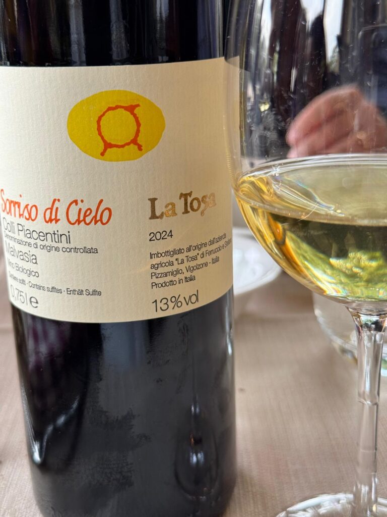 L’Azienda Agricola La Tosa è stata fondata dai fratelli Stefano e Ferruccio Pizzamiglio, che negli anni ’80 hanno investito sulle colline della Val Nure per fondare un progetto vitivinicolo focalizzato su altissima qualità e vitigni autoctoni. L’azienda oggi gestisce circa 19 ettari di vigneto, dedicando particolare attenzione all’inerbimento, alla conduzione biologica certificata (dal 2018) e al rispetto del terroir. Il “Sorriso di Cielo” 2024 rappresenta la loro splendida interpretazione della Malvasia di Candia Aromatica DOC in versione ferma, in zona Terre Rosse antiche, dai suoli argillosi. Affinata 5 mesi sui lieviti e con batonnage, costituisce una lettura sofisticata e più contemporanea della Malvasia di Candia, tradizionalmente frizzante ma qui interpretata in una versione ferma, più complessa e di gran potenziale evolutivo. Di grande finezza, pulizia e bevibilità anche l’Ortrugo Doc “Terrafiaba” 2024, il Terre della Tosa Gutturnio Superiore 2024 e la Malvasia Passito ”L’Ora felice” 2023, tra l’altro in abbinamento con una goduriosa e rinomata crostata di fichi di Albarola.