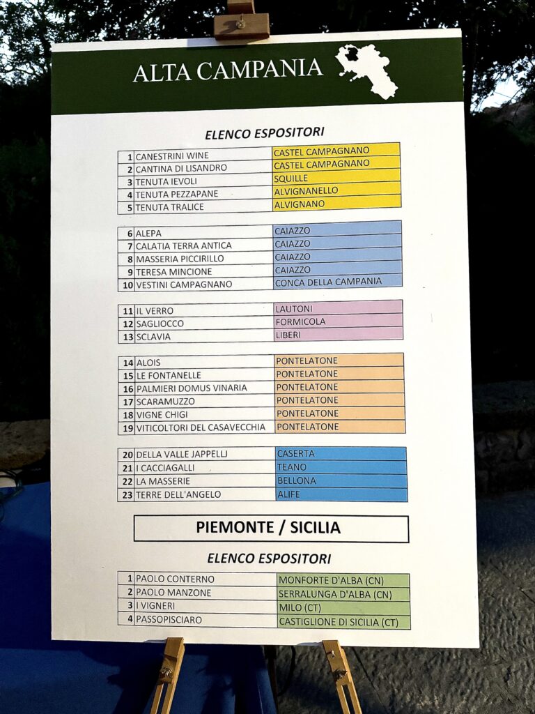 L’incontro ha visto anche il lancio del “Tour dell’Alta Campania”, organizzato dalla Pro Loco Real Sito di San Leucio: un itinerario di quattro giorni tra vigneti, caseifici di mozzarella di bufala, birrifici artigianali, l’Acquedotto Carolino e il Museo della Seta. La giornata si è poi conclusa con una degustazione curata dall’AIS Caserta, accompagnata dai piatti dello chef Antonio Papale e da prodotti tipici del territorio (olio e formaggi).
